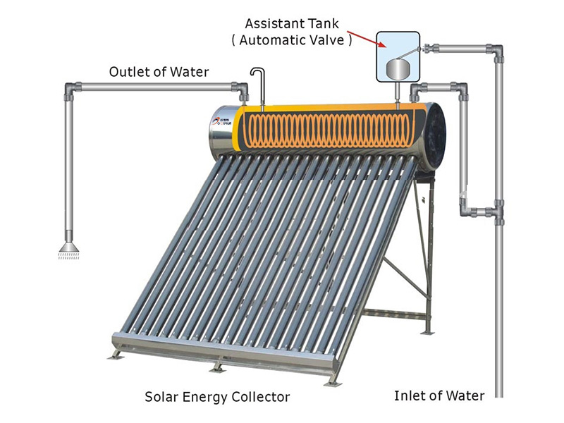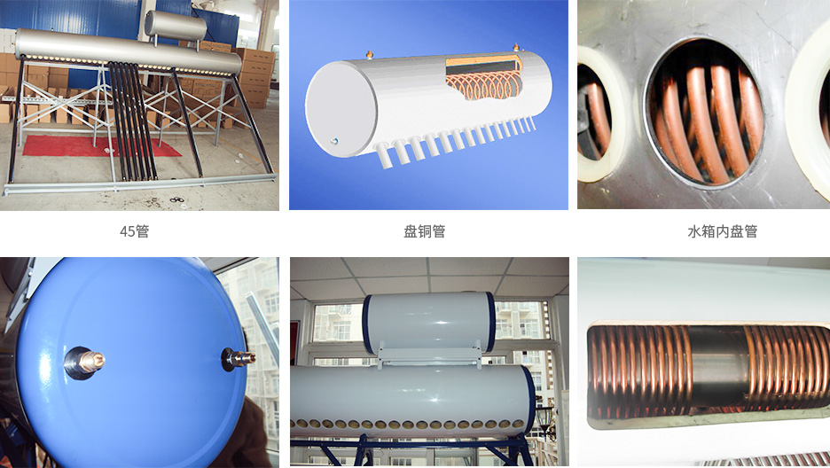 Sunlight in the vacuum tube,then the tube absorbs heat, the hot water in the pipe transferred to the tank ,with cold water via the copper coil ,exchange the heat of the water in the tank, the second heat exchange , hot water out.