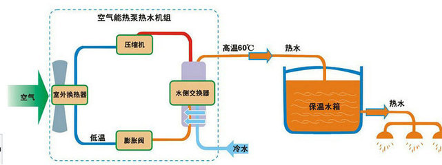 空氣能熱泵機組是采用制冷原理從空氣中吸收熱量來加熱水的“熱量搬運”裝置。把一種沸點為零下10多℃的制冷劑通到交換機中,制冷劑通過蒸發(fā)由液態(tài)變成氣態(tài)從空氣中吸收熱量。再經(jīng)過壓縮機加壓做工,制冷劑的溫度就能驟升至80-120℃。而后,高溫高壓的制冷劑被通到儲水箱中的毛細管中對水放熱,后通過節(jié)流裝置的降壓作用再變成低溫低壓的液態(tài)制冷劑,就能再次到空氣中吸收熱量。這樣就完成了一個“加熱-放熱”的工作流程。