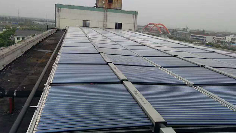 該熱水循環(huán)系統(tǒng)主要遵循工業(yè)用熱水循環(huán)的標(biāo)準(zhǔn),使用2500多支太陽能真空管用于夏季制取生產(chǎn)用的高溫回收熱水。整個(gè)系統(tǒng)使用了多套管式太陽能集熱器、熱水循環(huán)泵、大型水箱等,安裝在廠房樓頂?shù)目盏厣?。安裝人員通過專用工程數(shù)據(jù)和綜合實(shí)際安裝現(xiàn)實(shí),在樓頂調(diào)整好集熱板角度,使大限度獲得太陽能源,又能滿足工廠對樓頂安裝太陽能的要求。