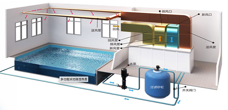 泳池除濕熱泵的工作原理:將池水表面蒸發(fā)的熱損失,回收利用,轉(zhuǎn)移到池水和空氣中,以滿足池水和空氣保溫所需的熱量。