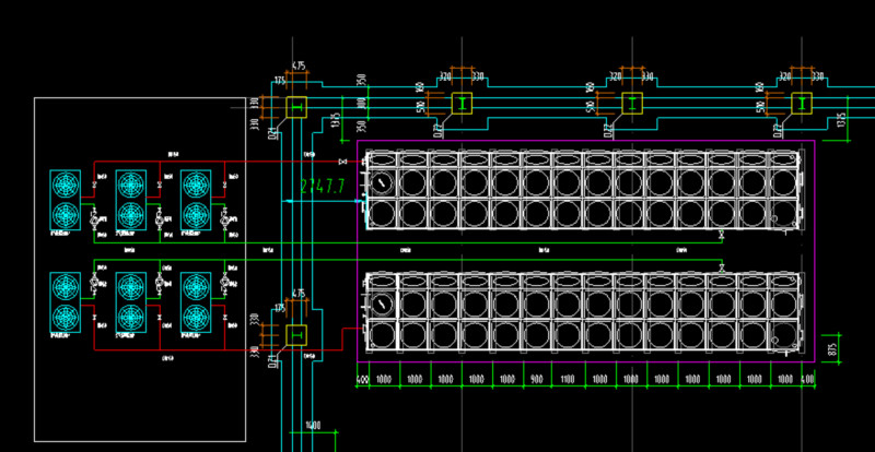 我們根據(jù)當(dāng)?shù)氐臍夂蚯闆r,再根據(jù)13個公寓,兩個食堂的熱水需求量,來配置了6臺空氣源熱泵和兩個水箱,加上循環(huán)泵等。如下圖: