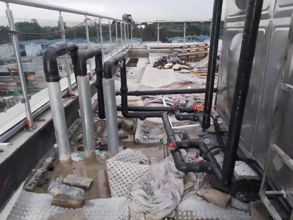 在晴好天氣時(shí),太陽(yáng)能對(duì)保溫水箱加熱,使保溫水箱內(nèi)的水溫升高;以此達(dá)到直接利用蓄熱水箱內(nèi)的熱水。若在連續(xù)陰、雨天或太陽(yáng)不足的情況下,太陽(yáng)能吸收的熱量不能滿足熱負(fù)荷的需要,自動(dòng)啟動(dòng)空氣源熱泵加熱至指定溫度(55℃;可調(diào)節(jié)),當(dāng)達(dá)到指定溫度后,設(shè)備停止工作,以最大化節(jié)約能源,同時(shí)保證熱水系統(tǒng)全天候正常供應(yīng)。