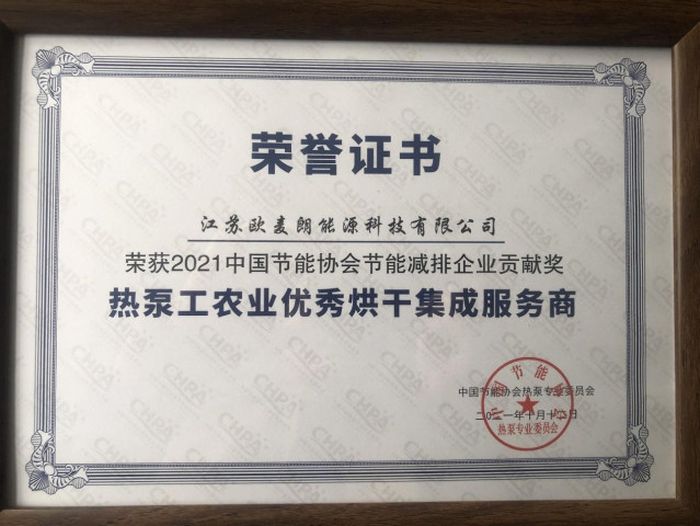 為表彰和獎勵在我國熱泵應用及研究領域做出突出貢獻的組織和個人,推動熱泵技術(shù)進步,促進產(chǎn)品市場應用,弘揚節(jié)能減排國策,助推可再生能源發(fā)展,樹立行業(yè)品牌標桿,中國節(jié)能協(xié)會熱泵專業(yè)委員會組織開展了“2021中國節(jié)能協(xié)會創(chuàng)新獎熱泵行業(yè)節(jié)能減排科技進步獎和節(jié)能減排貢獻獎”評選活動,歐麥朗憑借一流的研發(fā)水平、高效的系統(tǒng)集成能力、以及完善的售后服務體系,榮獲“熱泵工農(nóng)業(yè)優(yōu)秀烘干服務集成商”殊榮,這是對歐麥朗在烘干領域深耕多年成績的充分認可和嘉獎,也必將激勵我們在產(chǎn)品、技術(shù)、服務上再接再厲,永攀高峰,為國家節(jié)能減排的目標繼續(xù)做出貢獻!
