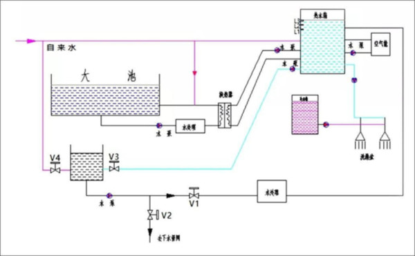 5.消耗熱水大的是游泳的小池。小池游泳的溫度是38℃,游泳的時(shí)間為15分鐘,在30℃的室內(nèi)環(huán)境中,能量損失是很小的。經(jīng)實(shí)測發(fā)現(xiàn),小池游完后水溫在35~36℃?;厥招〕?zé)崴疅崃渴窍到y(tǒng)能否在冬季滿足需求的關(guān)鍵。將小池的排水管路接上水泵、電動(dòng)閥V1和V2以及水處理設(shè)備。