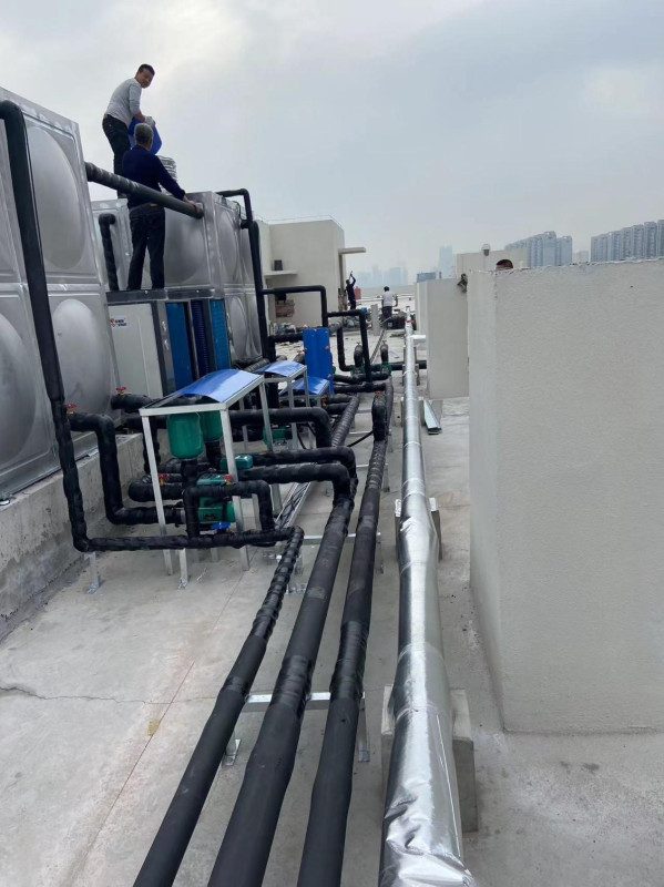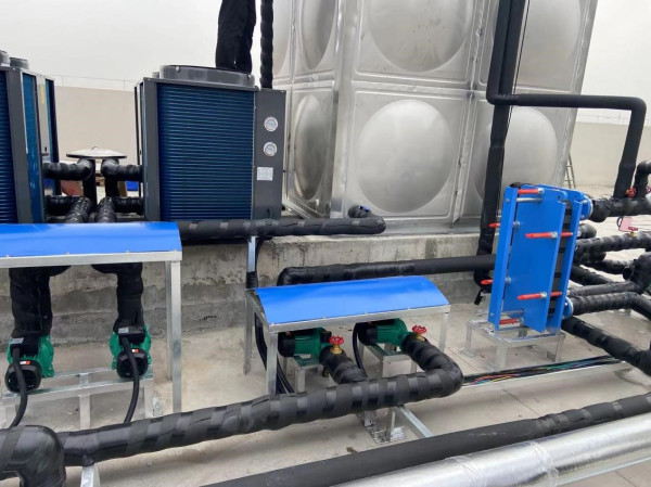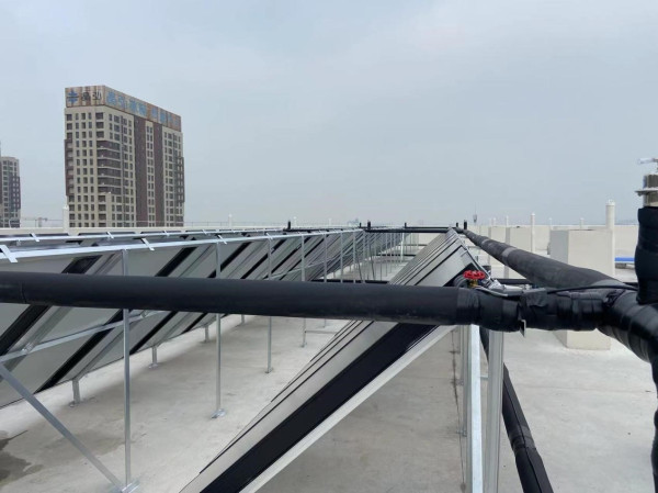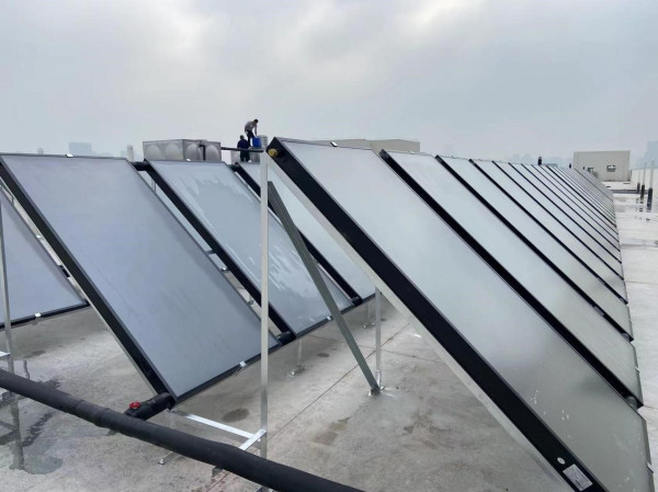 項(xiàng)目配置:8噸集熱水箱和8噸恒溫水箱,81組平板集熱太陽(yáng)能+2臺(tái)10P空氣能熱泵