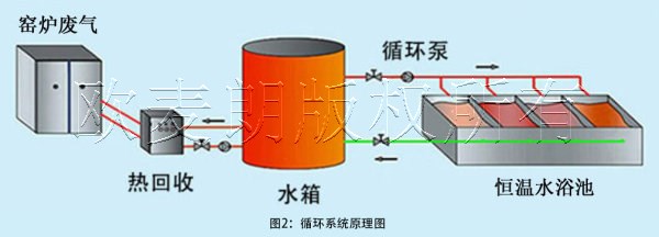 一是將廢氣換熱產(chǎn)生的高溫?zé)崴徊糠州斔偷狡渌a(chǎn)線上用于生產(chǎn),只留一部分用于恒溫池加熱,這個方案需要制備一個蓄熱水箱,用來儲備換熱器制取的熱水,熱水箱做兩路循環(huán)一路做為水池恒溫用,另一路作為生產(chǎn)車間使用。