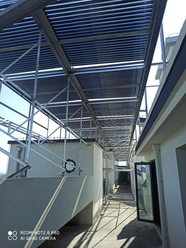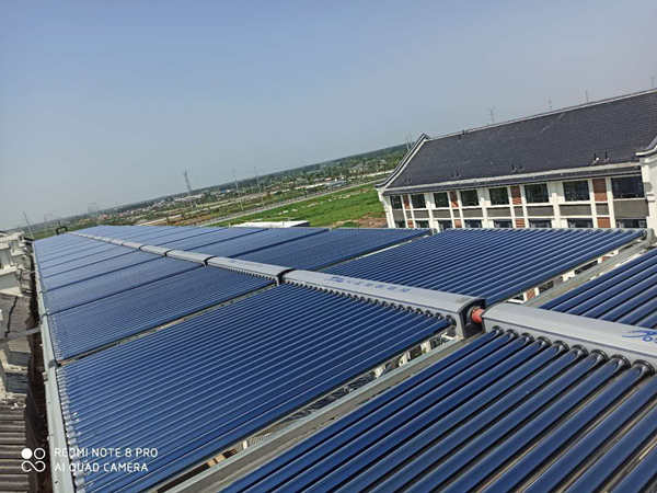此工程總共2棟樓(1、2#),總樓層高度6樓,每層12間房,每間住2-3人。屋頂設(shè)計(jì)熱水總水量分別為:(12噸、24噸),采用免費(fèi)能源(太陽能)為主+冷凝商用燃?xì)忮仩t為輔的加熱方式。
