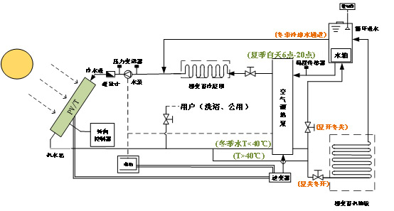 冬季工況時(shí),太陽(yáng)輻射太陽(yáng)能PV/T板進(jìn)行電量存儲(chǔ),通過(guò)壓力變送器驅(qū)動(dòng)水泵從水箱抽水對(duì)其進(jìn)行冷卻。從太陽(yáng)能PV/T板冷卻通道出來(lái)的熱水一部分供給用戶用于洗浴、公共設(shè)施用水外,另一部分用于相變地板儲(chǔ)熱。當(dāng)水溫高于40℃時(shí),熱水直接進(jìn)入相變地板儲(chǔ)熱,當(dāng)水溫低于40℃時(shí),開(kāi)啟空氣源熱泵對(duì)其進(jìn)行加熱后對(duì)地板進(jìn)行熱量存儲(chǔ),經(jīng)過(guò)地板的出水直接進(jìn)入水箱循環(huán)使用。